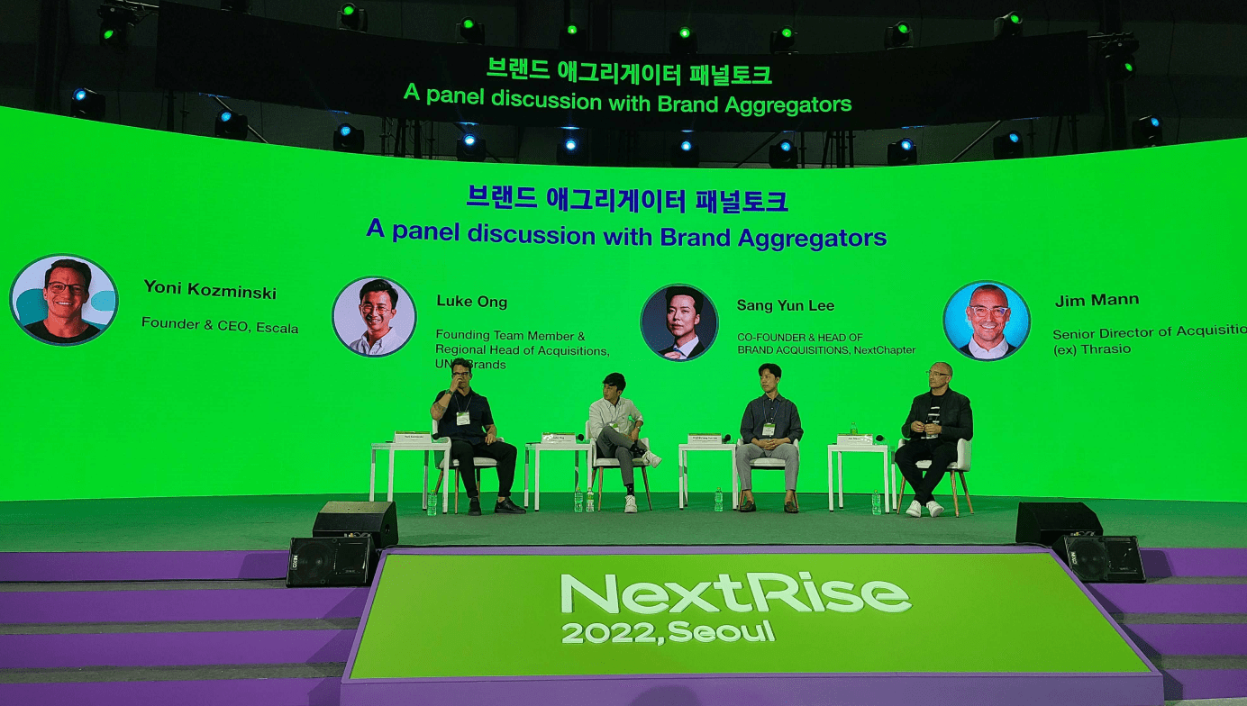 (2022년 6월 16일, 서울) 삼성동 코엑스에서 열린 국내 최대 규모 글로벌 스타트업 컨퍼런스 ‘NextRise 2022, Seoul’에서 넥스트챕터의 이상윤 브랜드인수본부장이 국내 대표 브랜드 애그리게이터로서, ‘A Panel Discussion with Brand Aggregators’에 참석하였습니다. 이 날 패널 디스커션에는 미국 시장 최대규모 브랜드 애그리게이터 Thrasio의 Jim Mann, 동남아 시장 기반의 브랜드 애그리게이터 UNA Brands의 Luke Ong이 참석하였으며, 글로벌 이커머스 컨설팅 회사인 ESCALA의 Yoni Kozminski가 모더레이터로서 토론을 진행하였습니다.