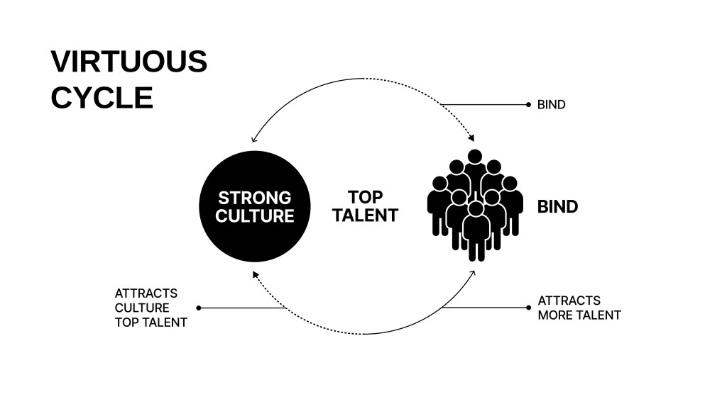 최고의 인재와 강력한 문화는 서로 필수 불가결한 관계라고 생각합니다. 최고의 인재를 채용하고 유지하기 위해선 그들을 끌어당겨 결속시킬 강력한 문화가 필요하고, 강력한 문화는 최고의 인재들이 한 방향을 바라보고 서로 협력할 수 있도록 하는 촉매의 역할을 하니까요.